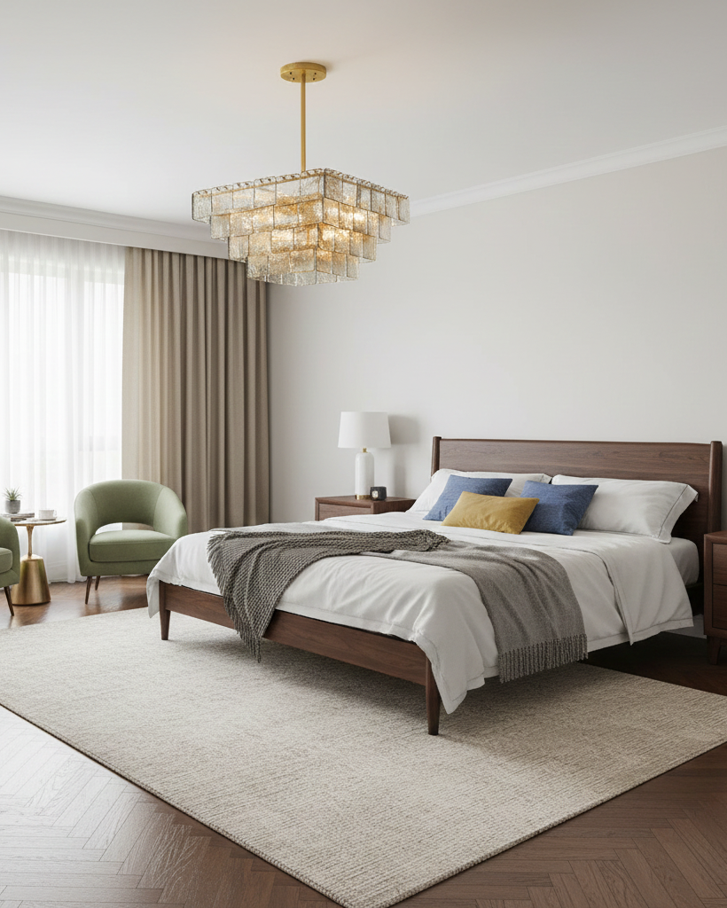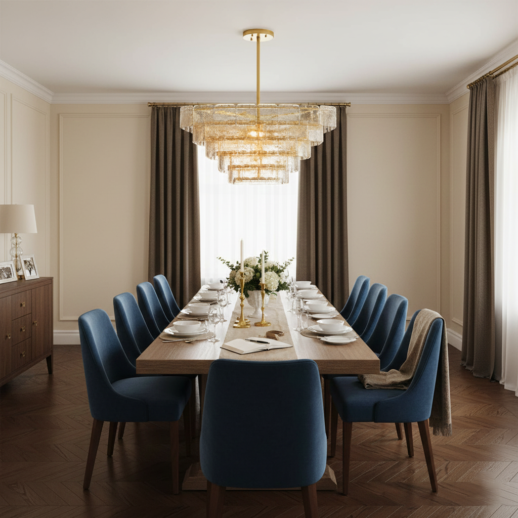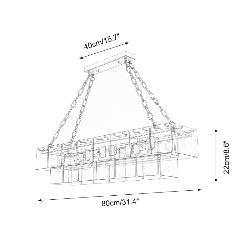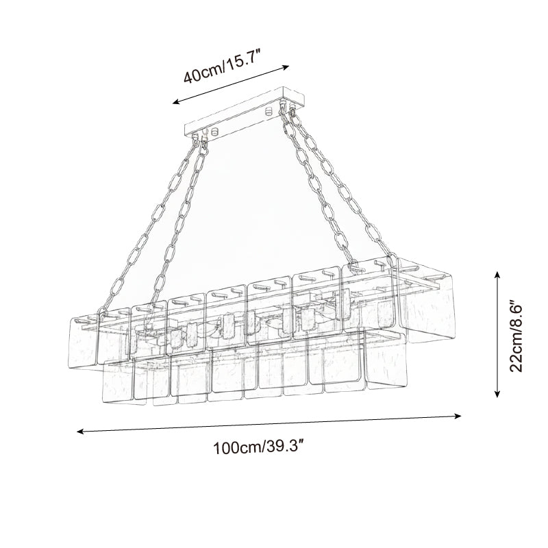 A bold interplay of geometry and glow, the Revelation Chandelier is a sculptural statement that redefines modern luxury. Crafted from stacked layers of molten-textured glass panels in soft amber hues, each square is uniquely rippled to catch and scatter light with a radiant, almost liquid brilliance. The stepped silhouette evokes a sense of movement and drama, while the golden framework adds a refined architectural elegance.