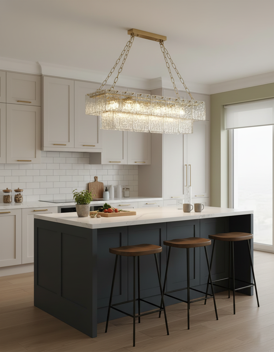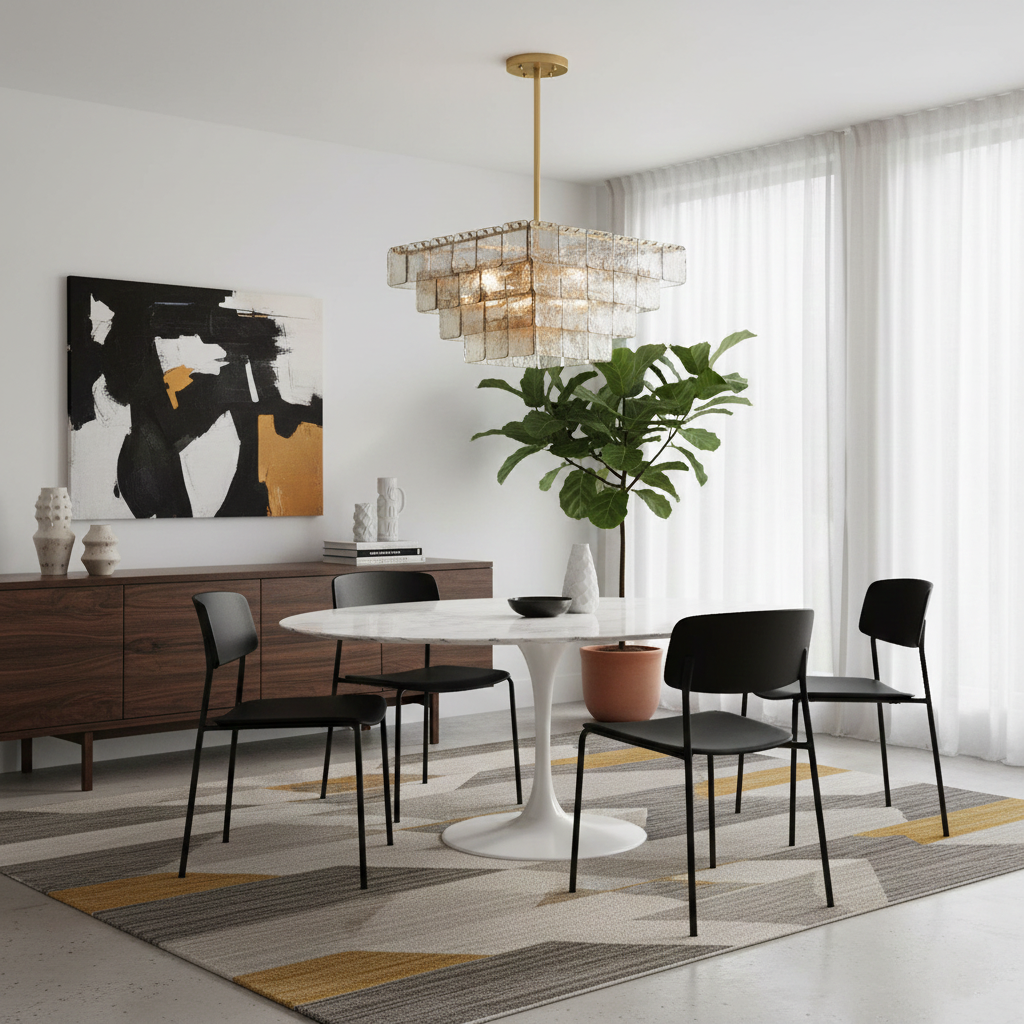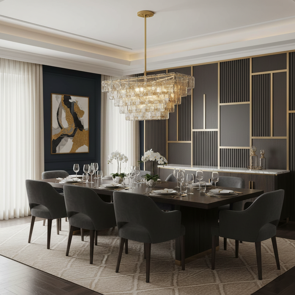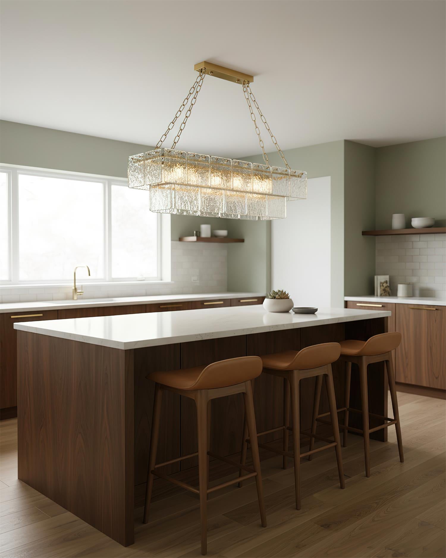 A bold interplay of geometry and glow, the Revelation Chandelier is a sculptural statement that redefines modern luxury. Crafted from stacked layers of molten-textured glass panels in soft amber hues, each square is uniquely rippled to catch and scatter light with a radiant, almost liquid brilliance. The stepped silhouette evokes a sense of movement and drama, while the golden framework adds a refined architectural elegance.