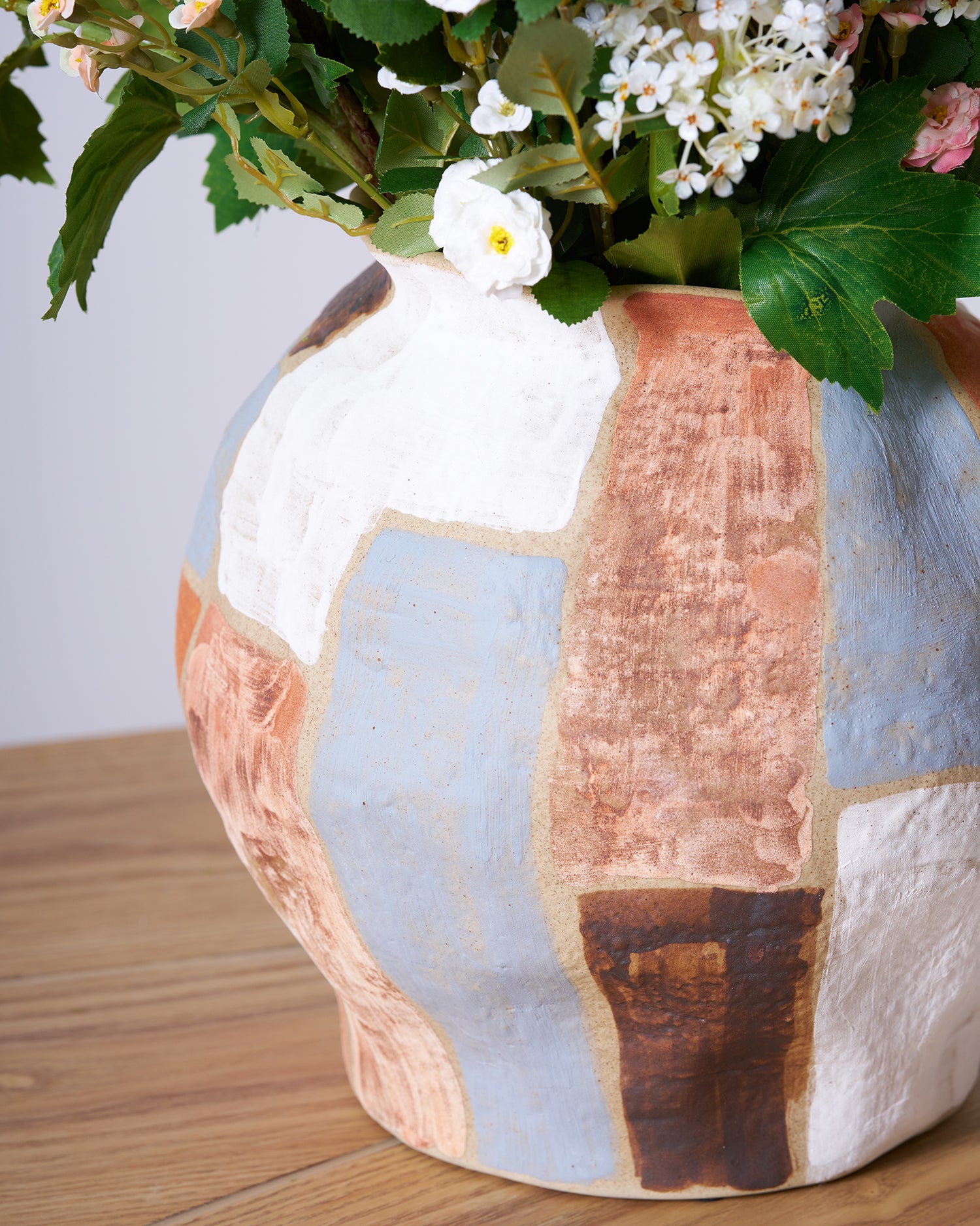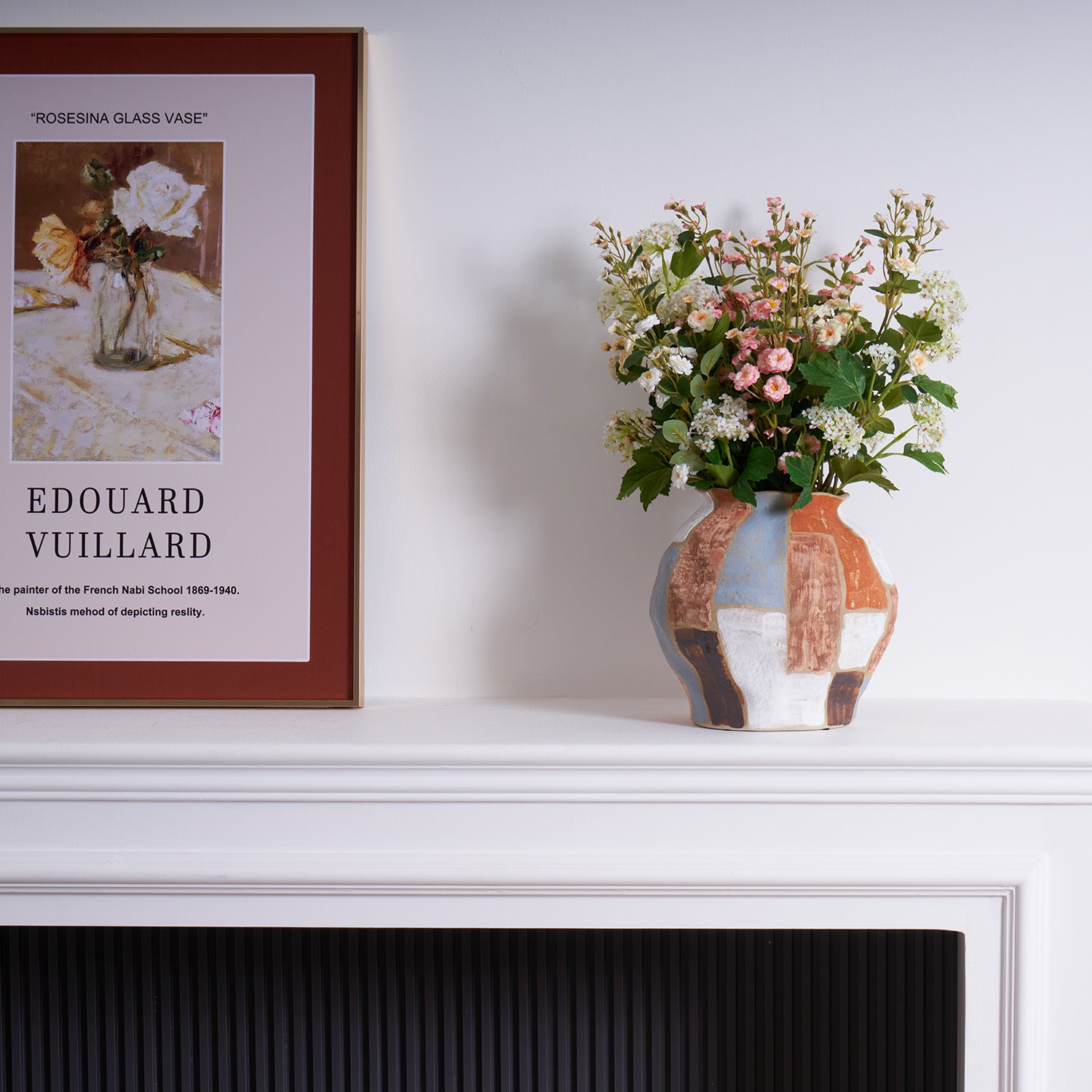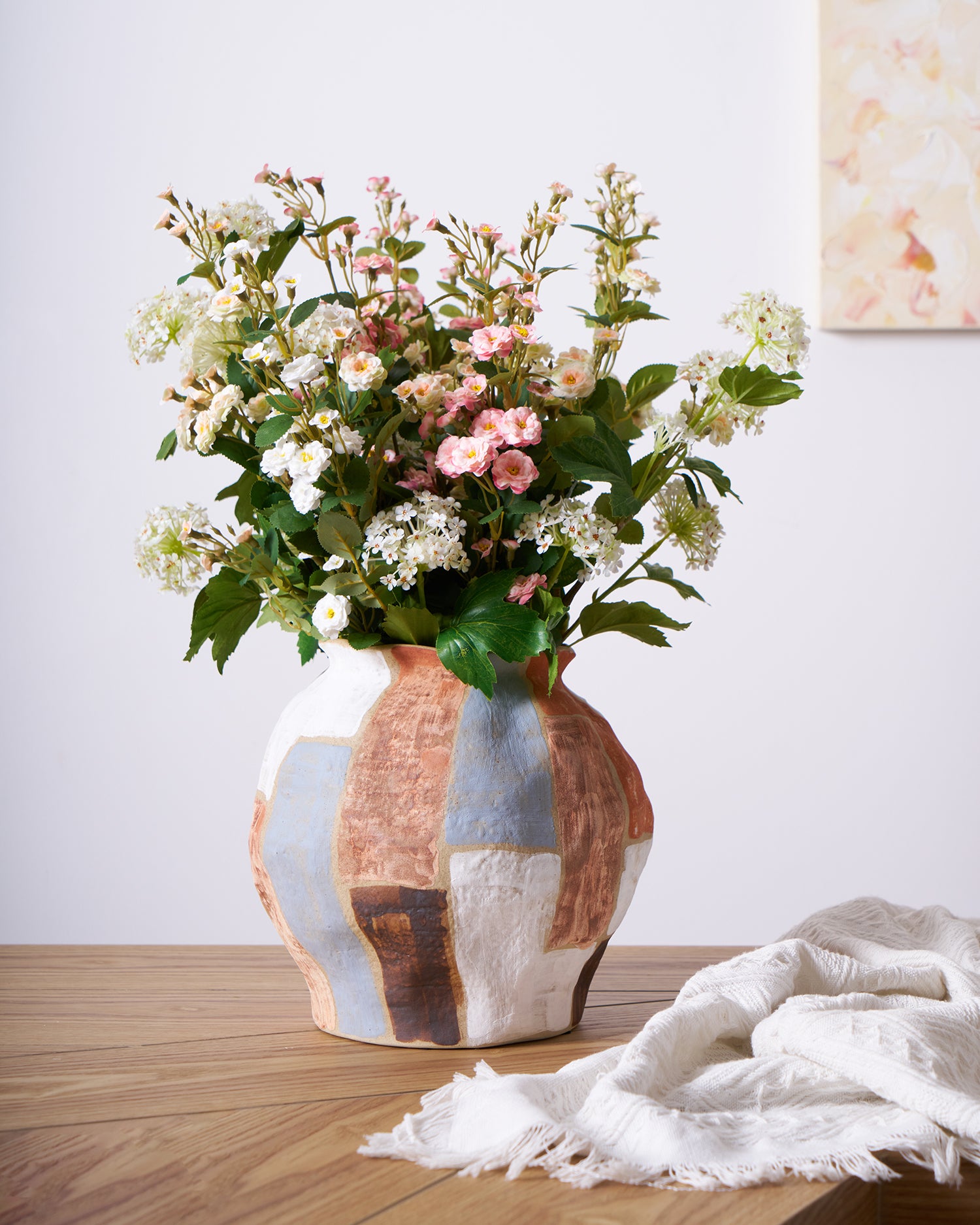This vase features a modern geometric design, combining a unique polyhedral shape with irregular color blocks for a distinctive visual effect. Each brightly colored ceramic piece is carefully selected and handcrafted, not only giving this artwork unparalleled uniqueness but also ensuring perfection in every detail.