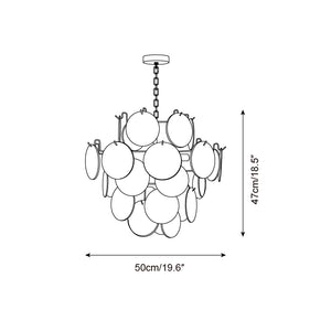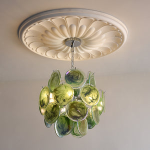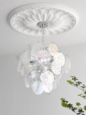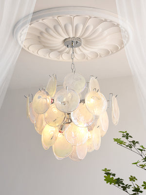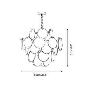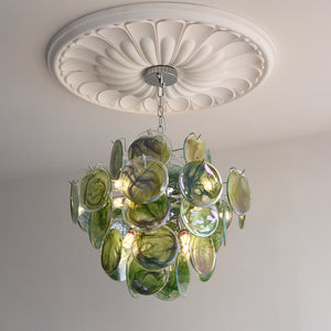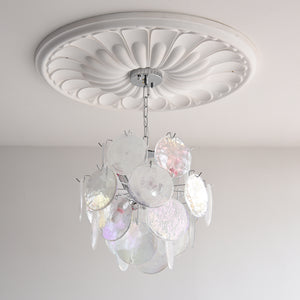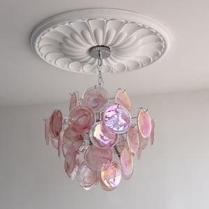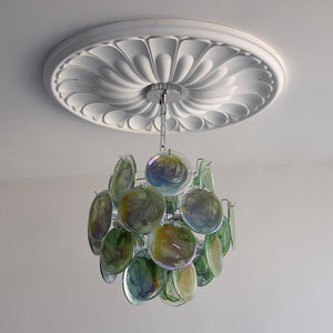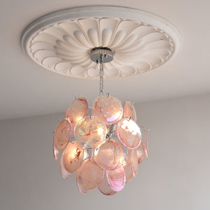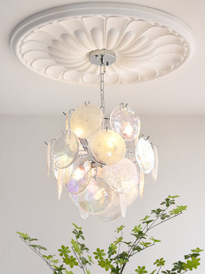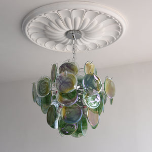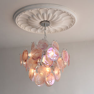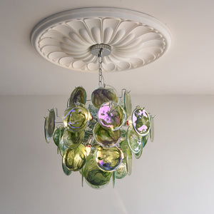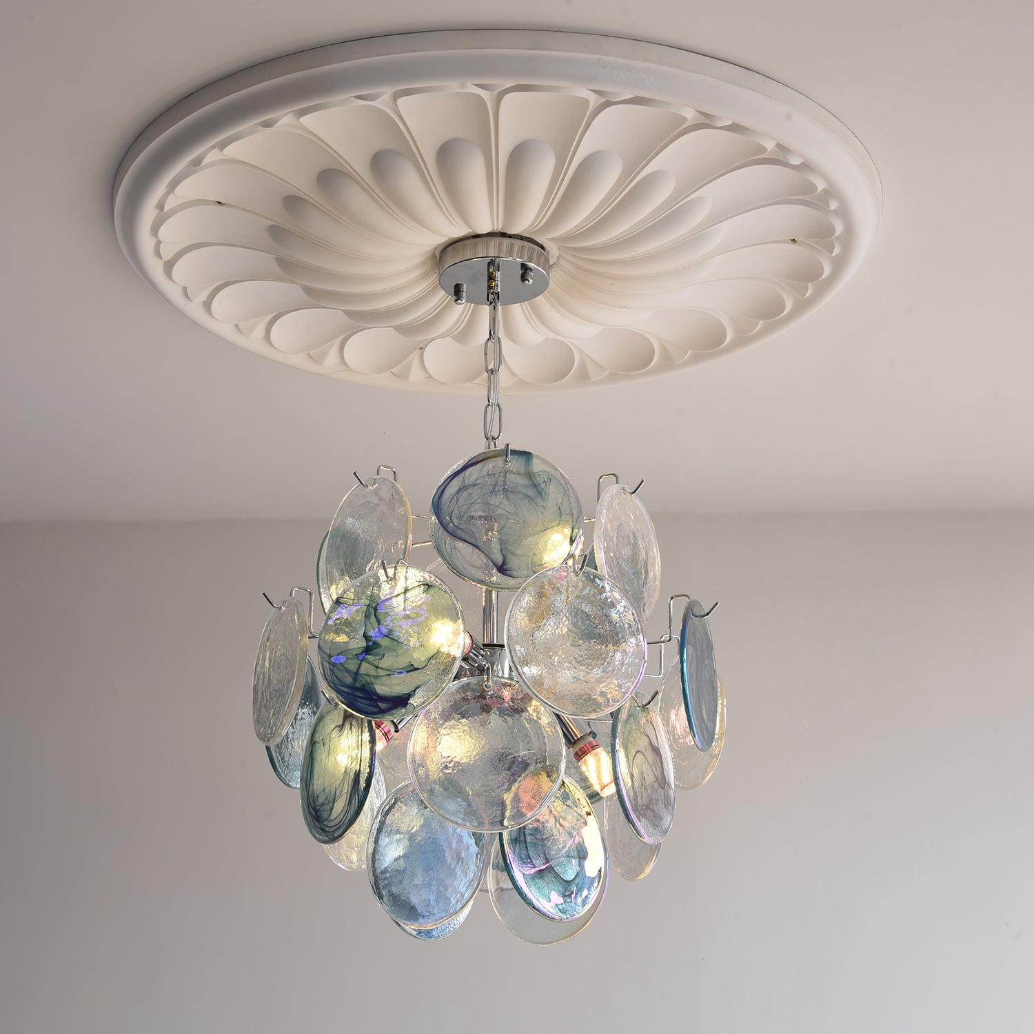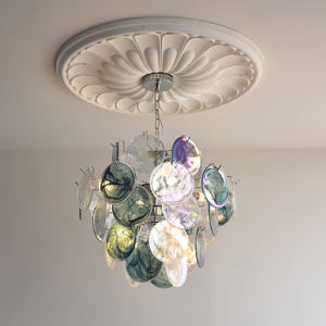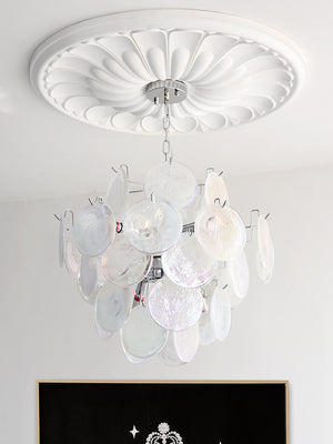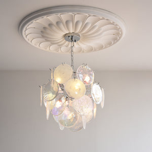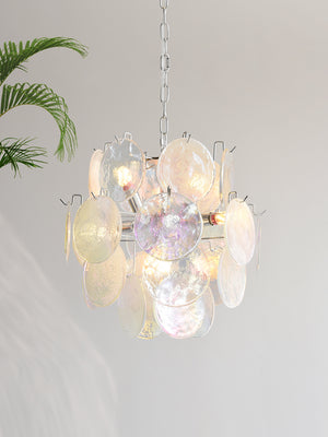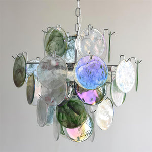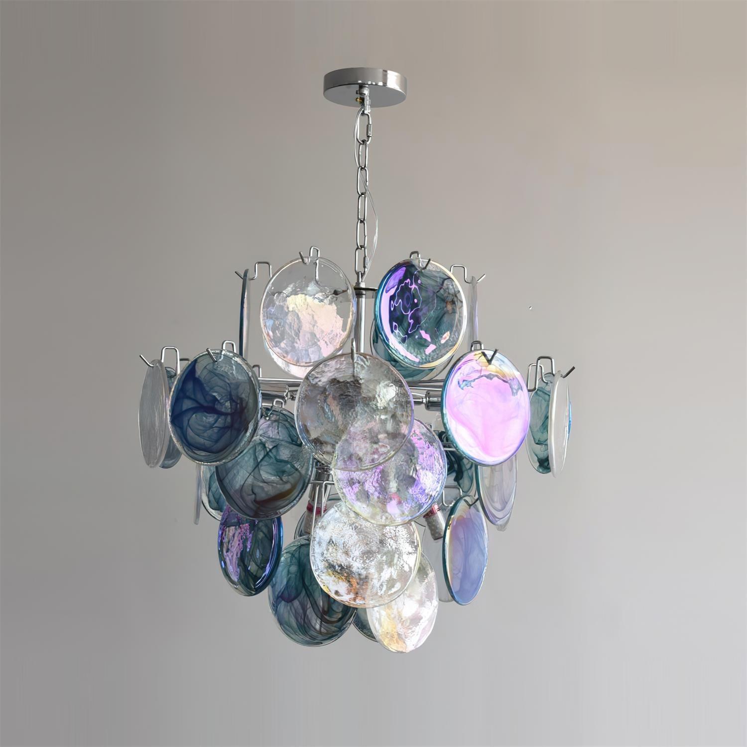 A dazzling reinterpretation of mid-century elegance, the Venfield Chandelier captivates with its sculptural play of iridescent glass discs. Each handcrafted piece is a delicate medley of pastel hues, swirled textures, and mirrored reflections—suspended like floating petals around a polished chrome frame. The layered composition evokes a sense of weightlessness, while the soft diffusion of light creates a radiant, dreamlike ambiance.